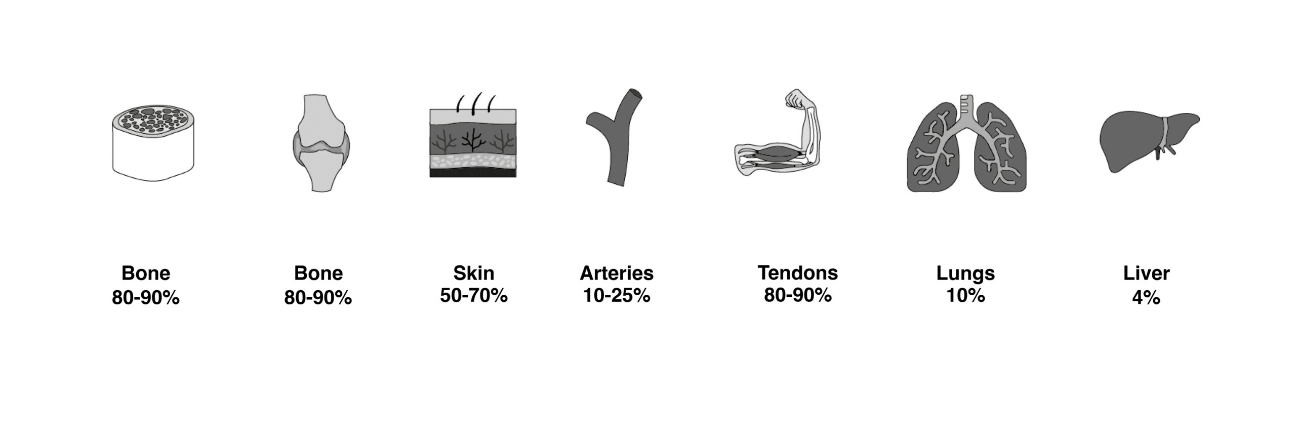 It is like the bodies scaffolding that holds tissues together. Hence it effects arteries, cartilage, skin, bone, lungs, liver and tendons. It affects your bodies resilience, strength + flexibility.